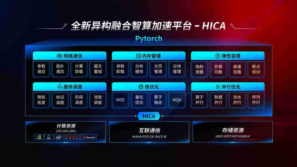 通过自研的服务层、、、中间适配层、、、、以及调度编排算法,,,采用数据并行、、、模型并行等多种并行方式,,,,把并行计算任务进行有效的分解,,,使其分别由相应的软件栈和算力资源来承接。。。当GPU资源变化,,,HICA可以实时动态调度计算子任务并调整模型拓扑和架构,,,,以充分聚合各种算力资源。。